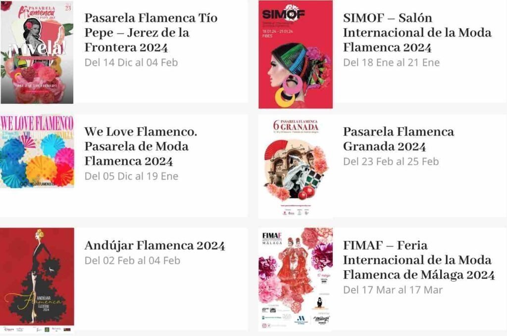 Aunque todavía no hay fechas establecidas, posteriormente llegará en febrero también la de Almonte, con Pasarela Doñana Flamenca. En el mes de marzo se desarrollarán las de Andújar Flamenca, FIMAF – Feria Internacional de la Moda Flamenca de Málaga, en Pilas (Sevilla), Muestra de Moda Flamenca de Pilas ‘Brisa Flamenca’. Sin salir de Sevilla, la que organiza Diputación, Feria de Sevillanas y Moda Flamenca de la Provincia de Sevilla, a primeros de abril; al igual que Premier Lunar – Moda Flamenca, organizada por la Cátedra Internacional de Moda Flamenca en Sevilla. Ya en marzo se celebrará la Pasarela Flamenco Ecuestre Córdoba. En junio una cita de nueva creación: SIMOF Madrid – Salón Internacional de la Moda Flamenca. La última de la temporada tiene lugar en Málaga en el mes de noviembre: Pasarela FEMAPE Flamenca.