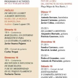 En esta edición, la organización de El Dorado – Sociedad Flamenca Barcelonesa, junto al Distrito de Nou Barris, ha decido poner el foco en la importancia de Barcelona en la consolidación de la guitarra clásica y flamenca, según nos comentaba el director de El Dorado, Pedro Barragán. De esta manera, la sonanta será el eje del prólogo de las jornadas los días 15 y 16 de julio en el Museu de la Música de Barcelona de la mano de Suárez Pajares y Norberto Torres. Las mismas se enmarcarán en el contexto del barrio del Eixample en la segunda mitad del siglo XIX, centro neurálgico de la modernidad de su tiempo que se convirtió en el núcleo guitarrístico más importante de España – asevera Barragán -, al que acudieron grandes del instrumento como Miguel Burrull, Julián Arcas o Tárrega, entre otros. Así como el guitarrista Miquel Llobet, vecino del barrio en aquella época y que llegó a impresionar al mismísimo Debussy.