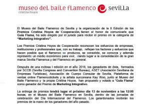 Parece que 2019 está siendo el año de reconocimiento del buen hacer de nuestra agenda cultural flamenca. Primero, allá por enero nos entregó un premio la Asociación Flamenco Jondo de Leganés (Madrid) por nuestro recorrido y bagaje en favor del arte flamenco. La Cámara de Comercio de Sevilla acogió nuestro proyecto europeo (e internacional) de venta de entradas online sobre el mes de marzo, y lo hizo suyo a través del proyecto Chebec. Y ahora, cuando Flama está dando un salto empresarial hacia una nueva web en inglés con la que acercar el flamenco a los aficionados internacionales, nos llega este reconocimiento desde uno de los espacios más reconocidos del flamenco en Sevilla, el Museo del Baile Flamenco de Sevilla, haciéndonos entrega del premio de la II Edición de los Premios Cristina Hoyos de Cooperación que reconoce a Flama en su categoría de Marketing integrativo.